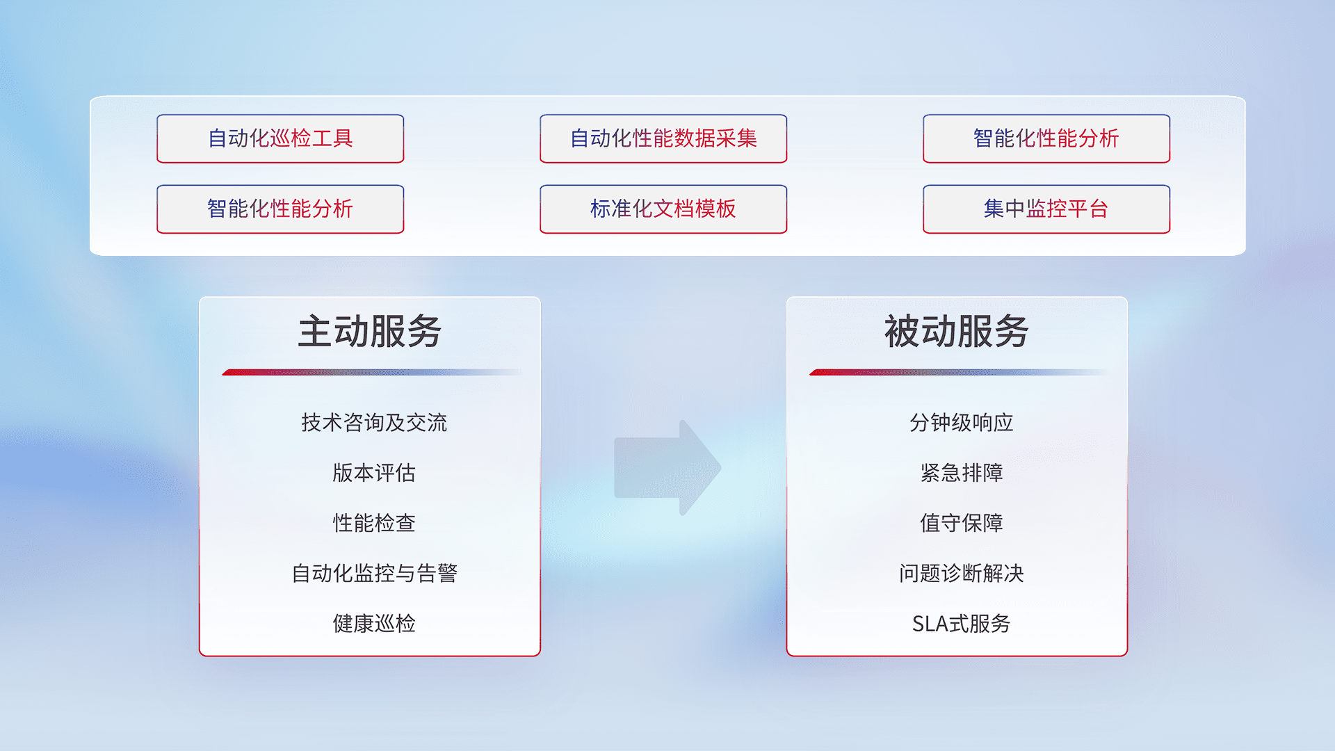 智能化工具和标准化文档,,保障服务质量,,提供主动服务(包含技术咨询、、、、版本评估、、性能检查、、、自动化监控与告警、、、、健康巡检)和被动服务包含(分钟级响应、、、紧急排障、、值守保障、、、、问题诊断解决、、SLA服务)。。。。