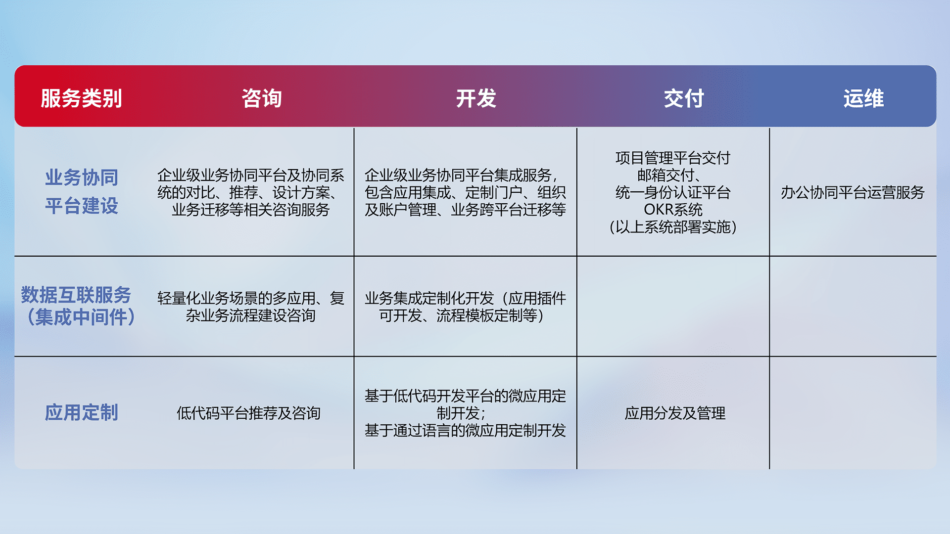 针对钉钉、、、、企微、、、IDaas等平台级产品提供产品的规划、、、方案、、、交付、、定制化开发等服务,,,实现如统一协同办公、、、智能客户服务、、、、混合会议管理、、、智能数据查询、、、、等业务场景,,,实现数字化转型。。。